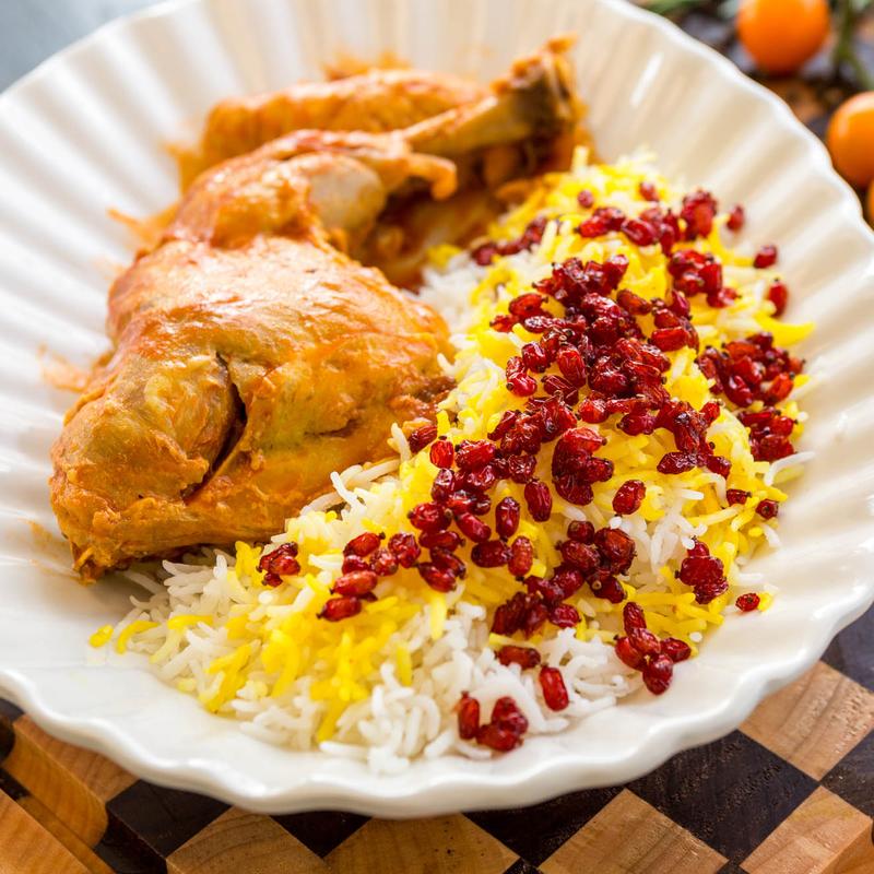 Chicken served with basmati rice topped with barberries and saffron.