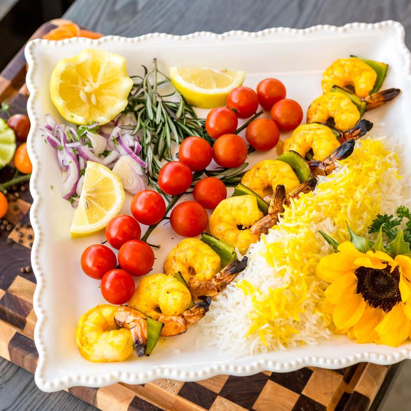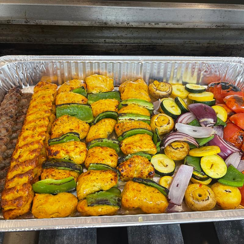 4 beef koobideh, 4 chicken koobideh, 2 skewer chicken barg kabob, 2 skewer veggie kabob, grilled tomatoes, and half tray of basmati rice with shirazi salad and cucumber-yogurt.