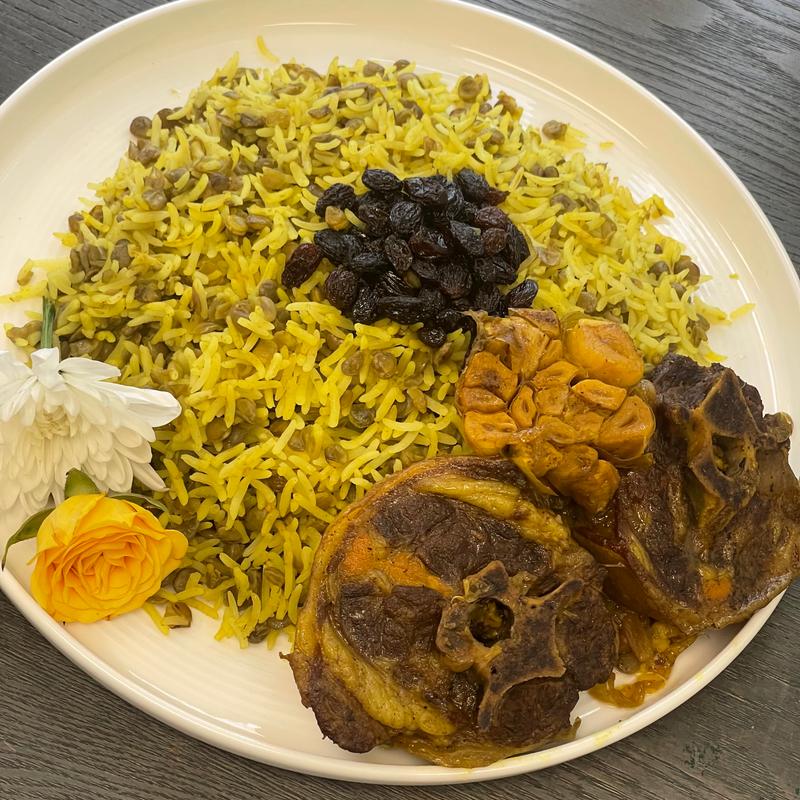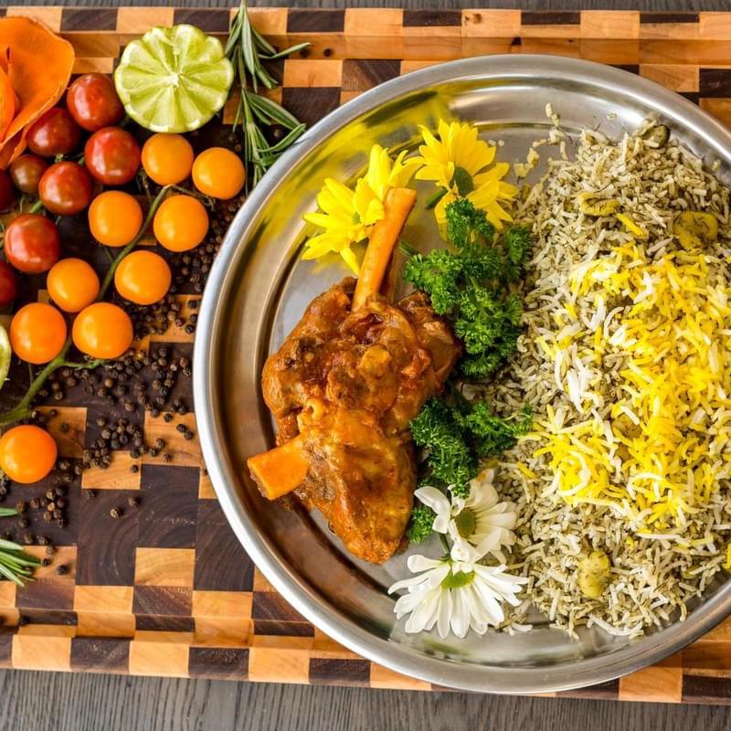 Stew with beef, finely chopped herbs, kidney beans, dried lime, and basmati rice.